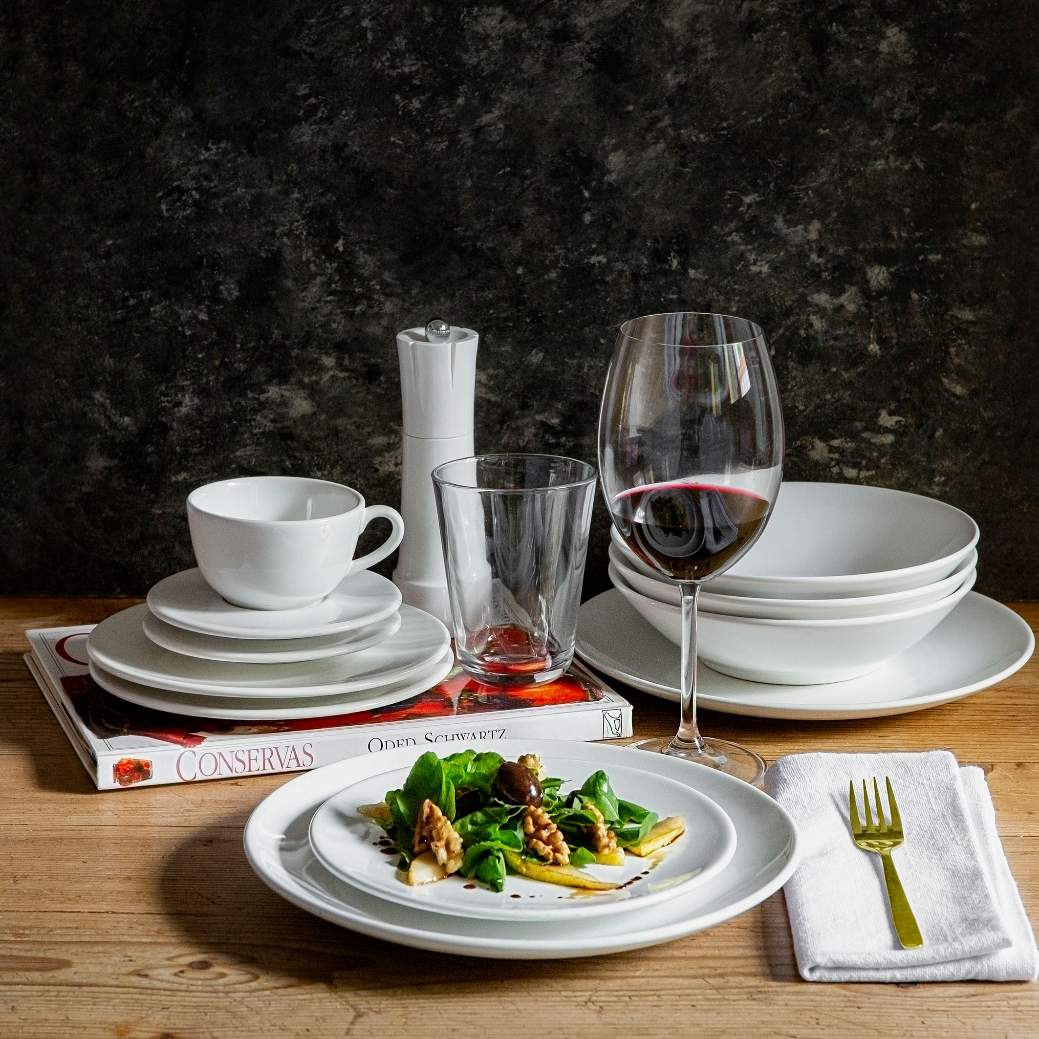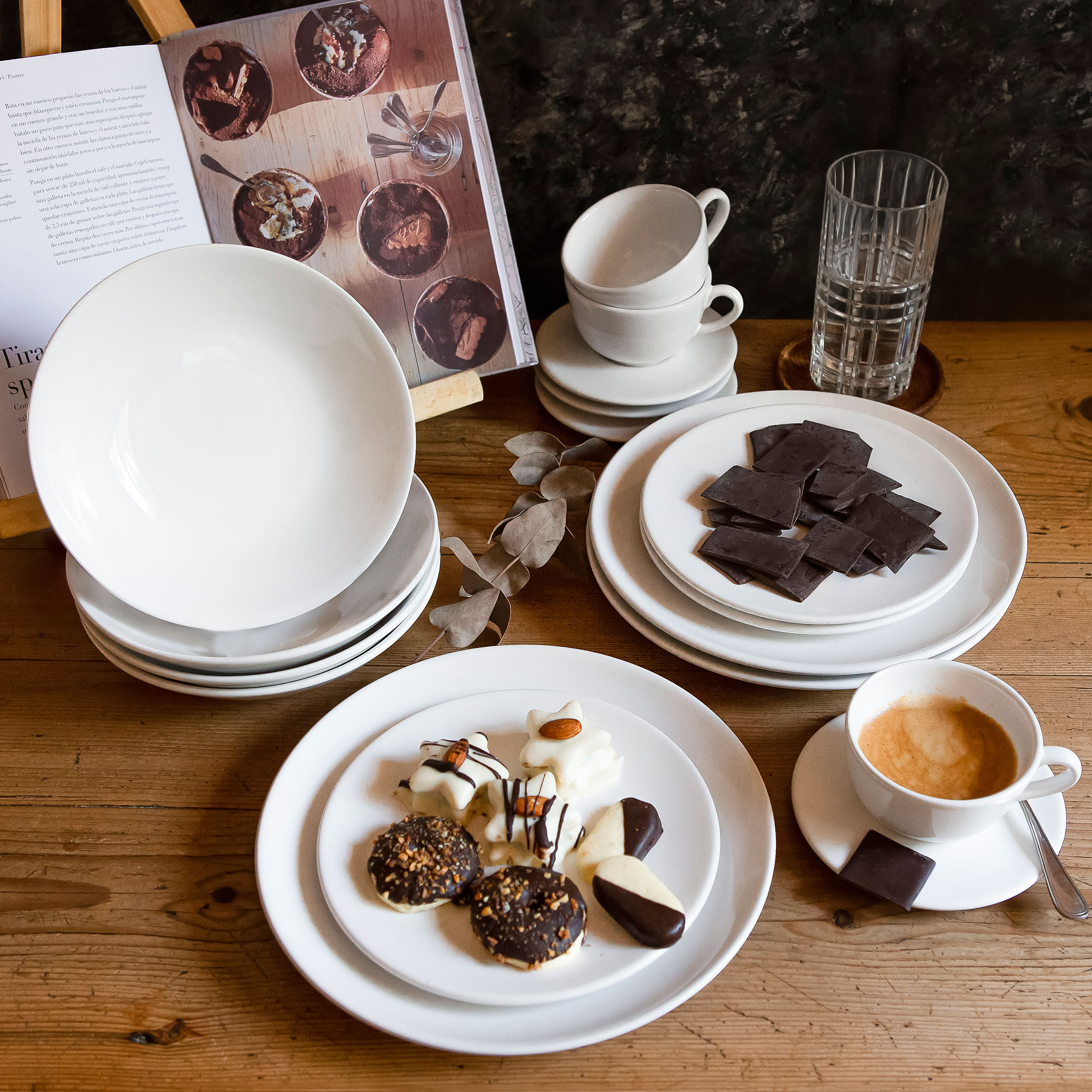 INCLUYE: 4 PLATOS PLAYOS 26 CM, 4 PLATOS HONDOS 20.5 CM, 4 PLATOS POSTRE 19 CM Y 4 TAZAS DE TE 200 CC CON PLATO
